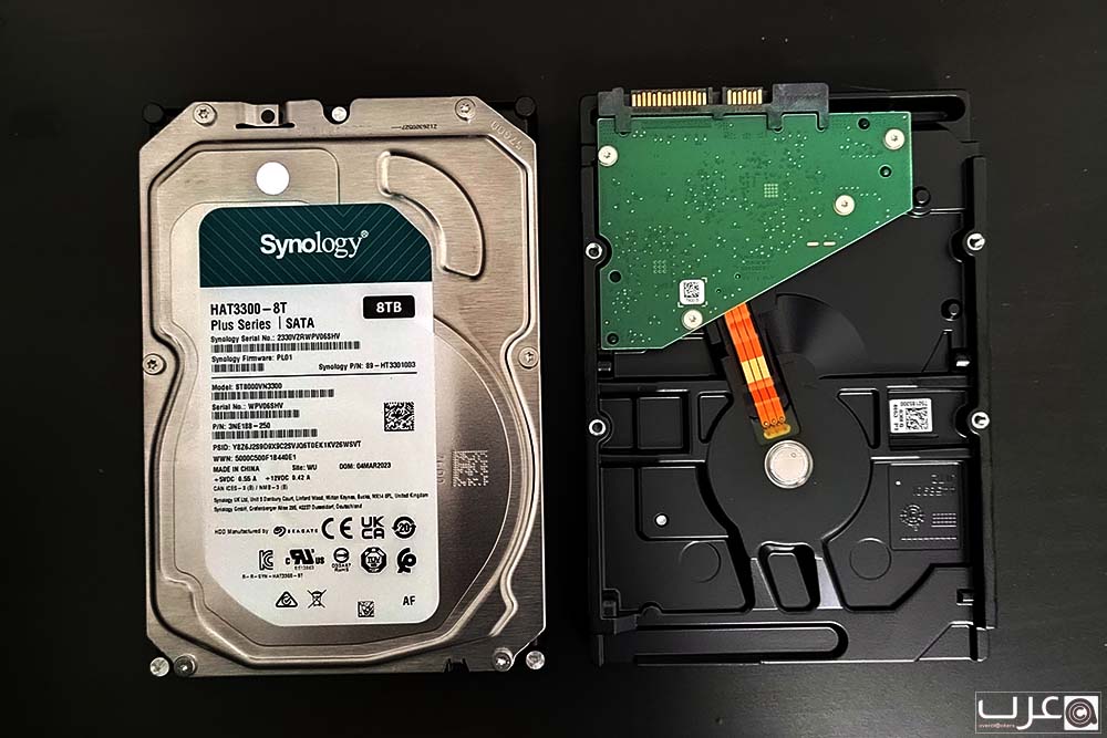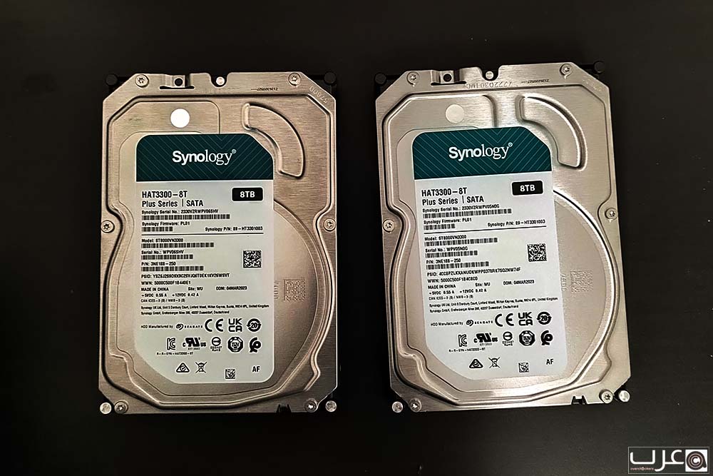 وقد استخدمنا اقراض تخزين HDD من Synology، ايضا، من سلسلة HAT3300 Plus بحجم 8 تيرابايت للقرص، في تشكيل بمجموع 16 تيرابايت.