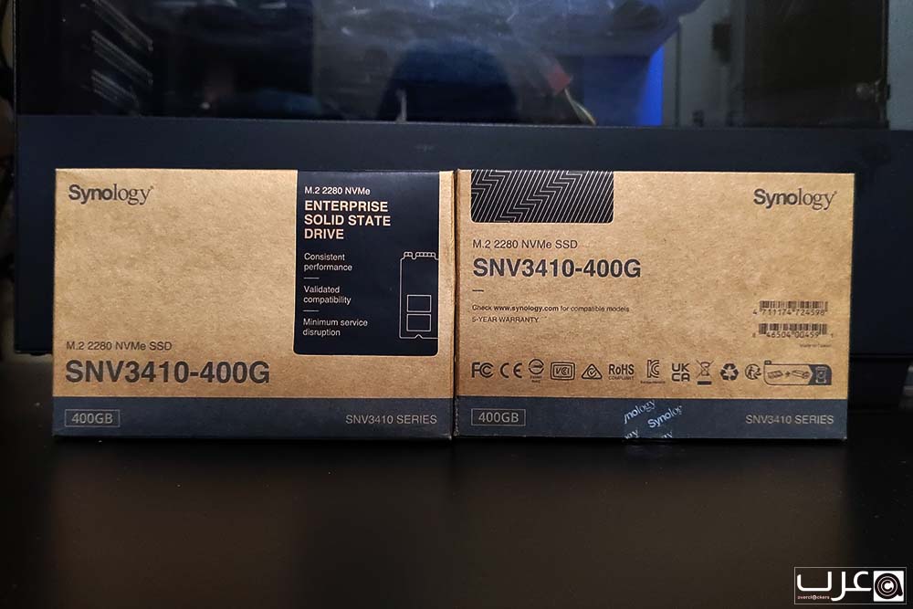 كما قدمت لنا Synology اقراص لاستخدام ميزة التخزين المؤقت من نوع SNV3410 بسعة 400 جيجابايت للقرص (تباع منفردة).