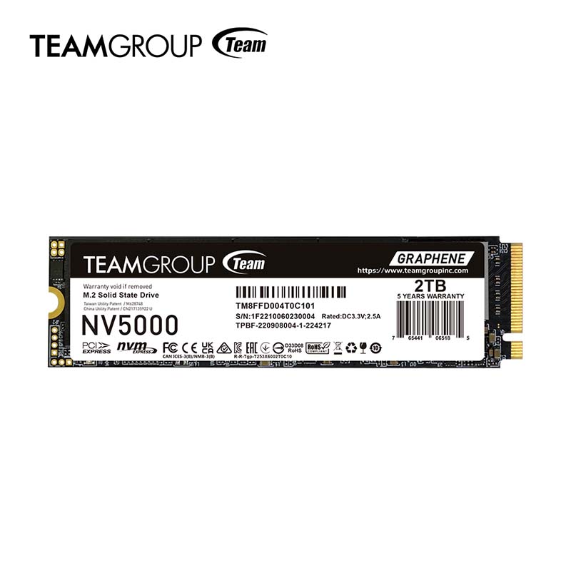 يتميز قرص التخزين ذو الحالة الصلبة TEAMGROUP NV5000 M.2 PCIe 4.0 بتقنية فلاش NAND ثلاثية الأبعاد المتقدمة، ويستخدم واجهة PCIe Gen 4×4 متوافقة مع معيار NVMe 1.4. بسعة تصل إلى 2 تيرابايت وسرعات قراءة تصل إلى 5000 ميجابايت/ثانية، مما يوفر أداءً أسرع بمرتين من أقراص PCIe Gen3 SSD، وأسرع بتسعة أضعاف من أقراص SATA SSD التقليدية. يقلل NV5000 من أوقات التحميل ويعزز أداء تعدد المهام اليومية، بما في ذلك الأنشطة الإنتاجية مثل إدارة المستندات والنسخ الاحتياطي للبيانات، بالإضافة إلى الأنشطة الترفيهية مثل تحرير الفيديو وتشغيل الألعاب. القرص مزود بعلامة الجرافين المبددة للحرارة الحاصلة على براءة اختراع حصرية من TEAMGROUP، والتي تخفض درجات حرارة التشغيل بفعالية. بسمك أقل من 1 مم، يمنع هذا الملصق تداخل التركيب، ويعمل بسلاسة مع مشتتات الحرارة M.2 للوحة الأم لتحسين كفاءة التبريد بشكل أكبر.