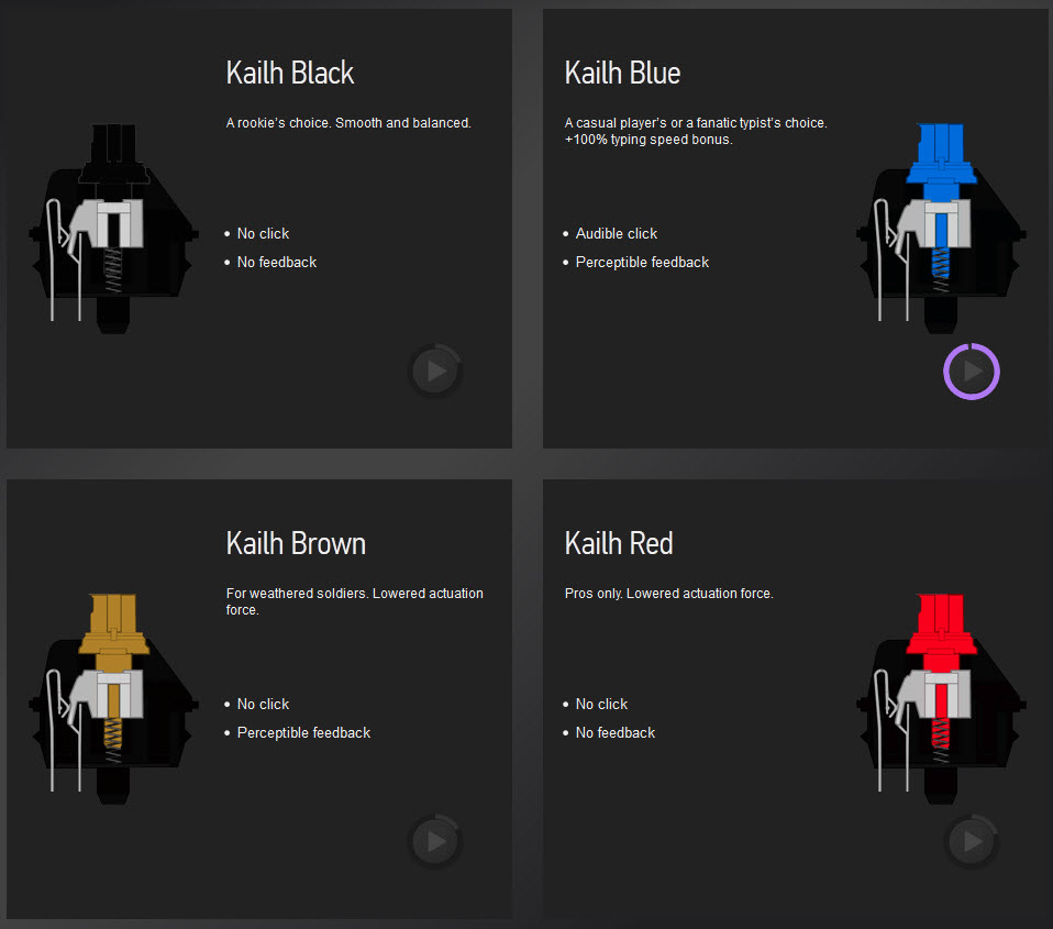 اللوحة تم انتاجها فعلياً بمختلف مفاتيح Kailh والنسخة التي وصلتنا هي التي تعمل بالأزرار الزرقاء والتي تشبه في لونها وتأثيرها ازرار Cherry MX Blue من حيث الصوت الصادر عنها.