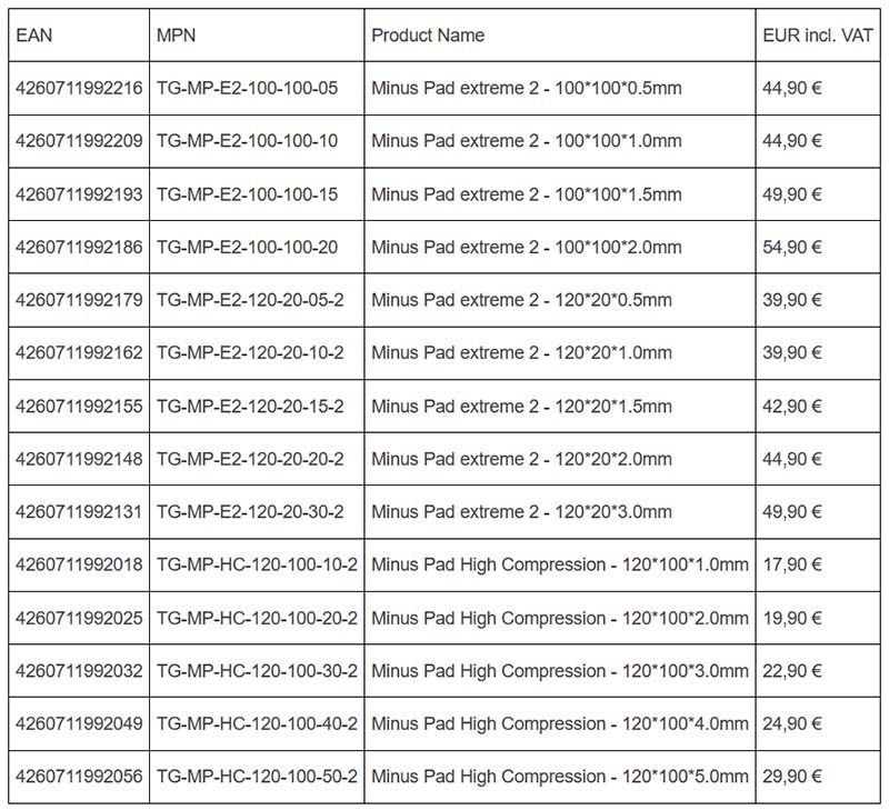 تتوفر وسائد Thermal Grizzly Minus Pads للطلب الآن عبر المتجر الرسمي للشركة أو من خلال شبكة الموزعين العالمية. اما عن الاسعار فهي كالتالي
