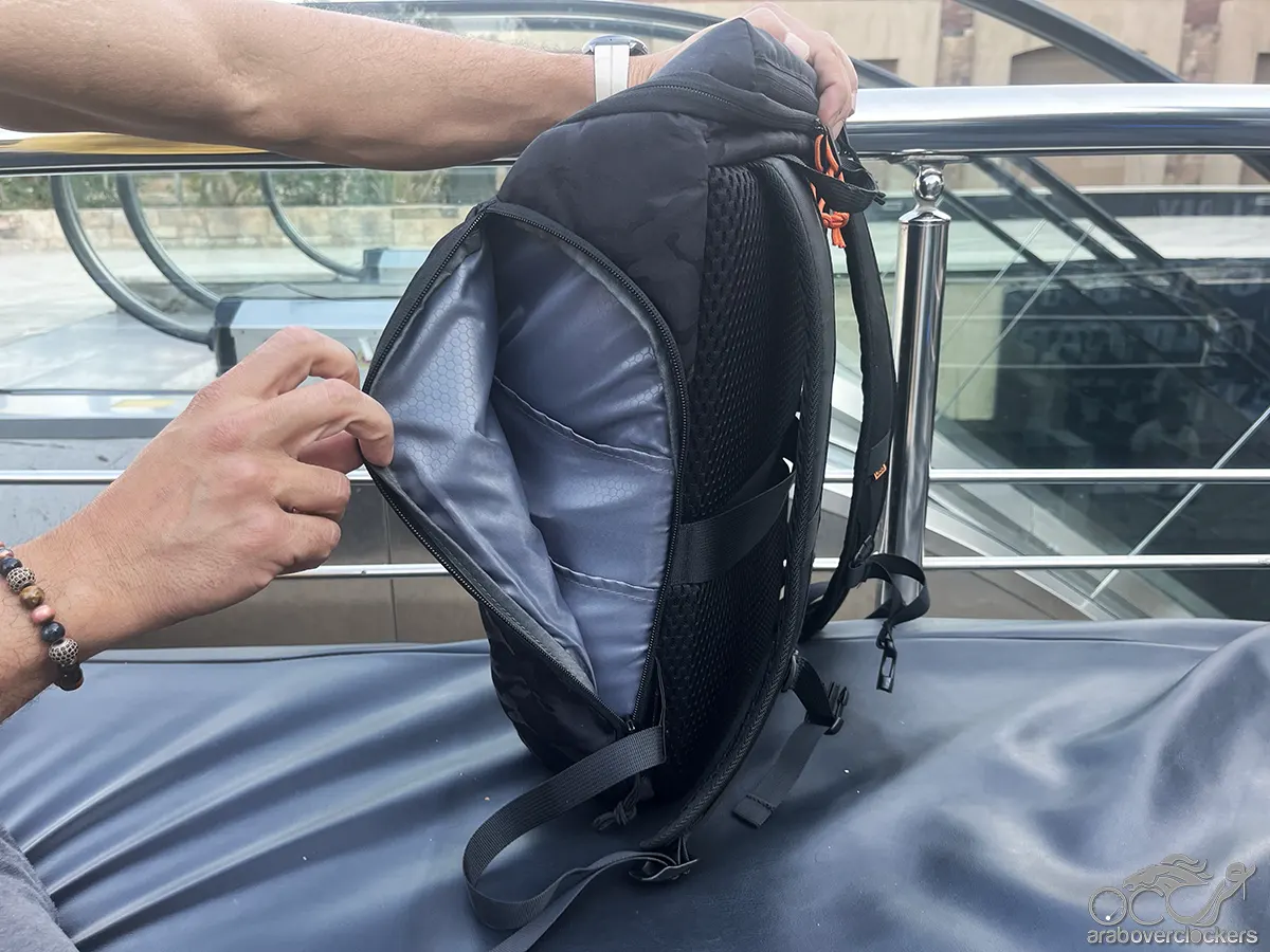 أما من ناحية الراحة أثناء الحمل، فقد قدمت الحقيبة تجربة جيدة بفضل أحزمة الكتف المبطنة والحزام الصدري الذي يساعد على توزيع الوزن بشكل أفضل أثناء الحركة. كما أن الطبقة الشبكية في الجزء الخلفي للحقيبة تساعد على تحسين التهوية وتقليل تراكم الحرارة أثناء الاستخدام لفترات طويلة، رغم أن مستوى التهوية يظل أقل من الحقائب المصممة خصيصًا للأنشطة الخارجية الطويلة.