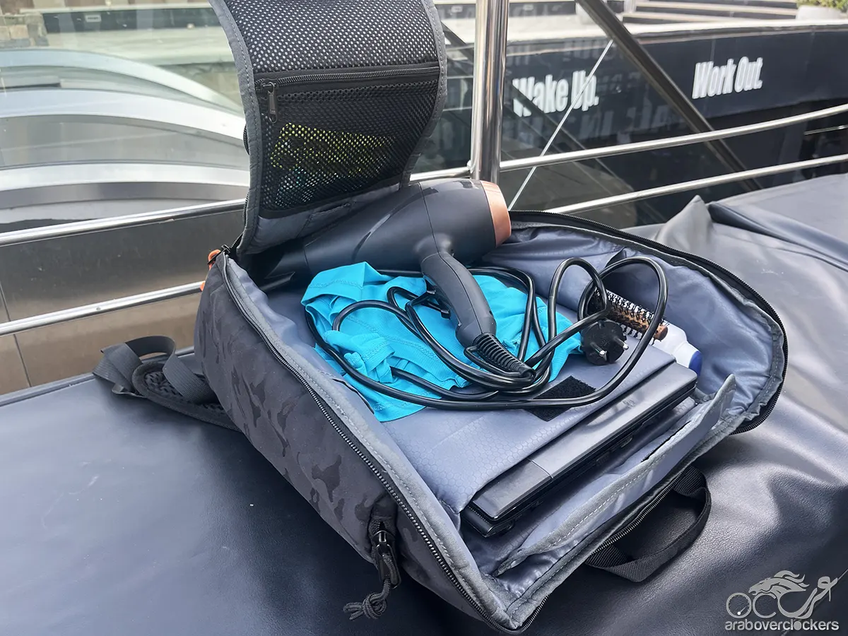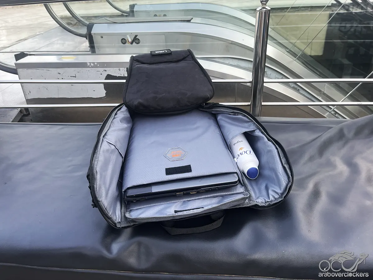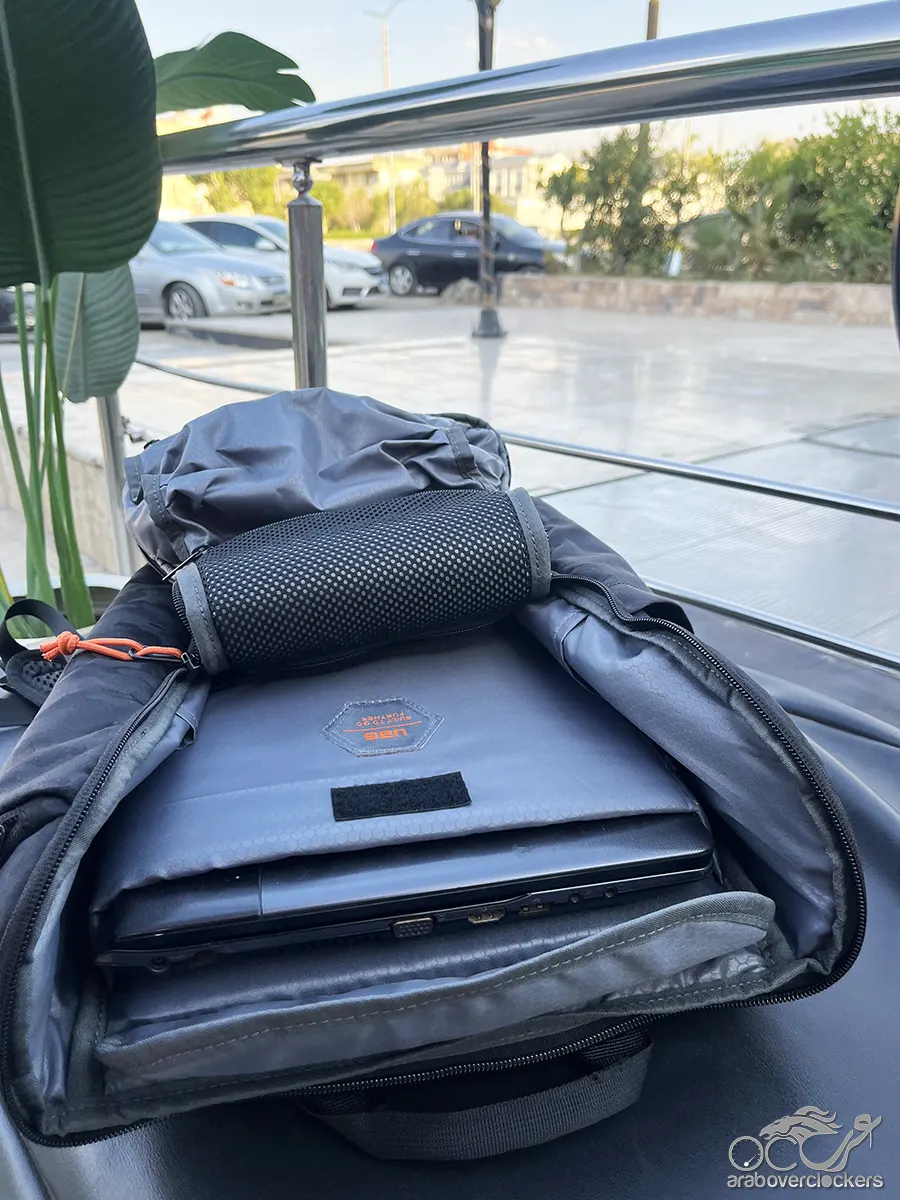 كما أن التصميم الداخلي للحقيبة يوفر مستوى جيدًا من التنظيم، حيث تسمح الجيوب المختلفة بترتيب الأجهزة والإكسسوارات بطريقة عملية تقلل من الفوضى داخل الحقيبة. وخلال الاستخدام الفعلي، تمكنت الحقيبة من استيعاب حاسب Samsung بقياس 15.6 بوصة إلى جانب المستندات والشواحن والكابلات والباور بانك وزجاجة المياه وبعض الأغراض الشخصية، مع بقاء المحتويات منظمة بفضل التقسيم الداخلي المدروس.