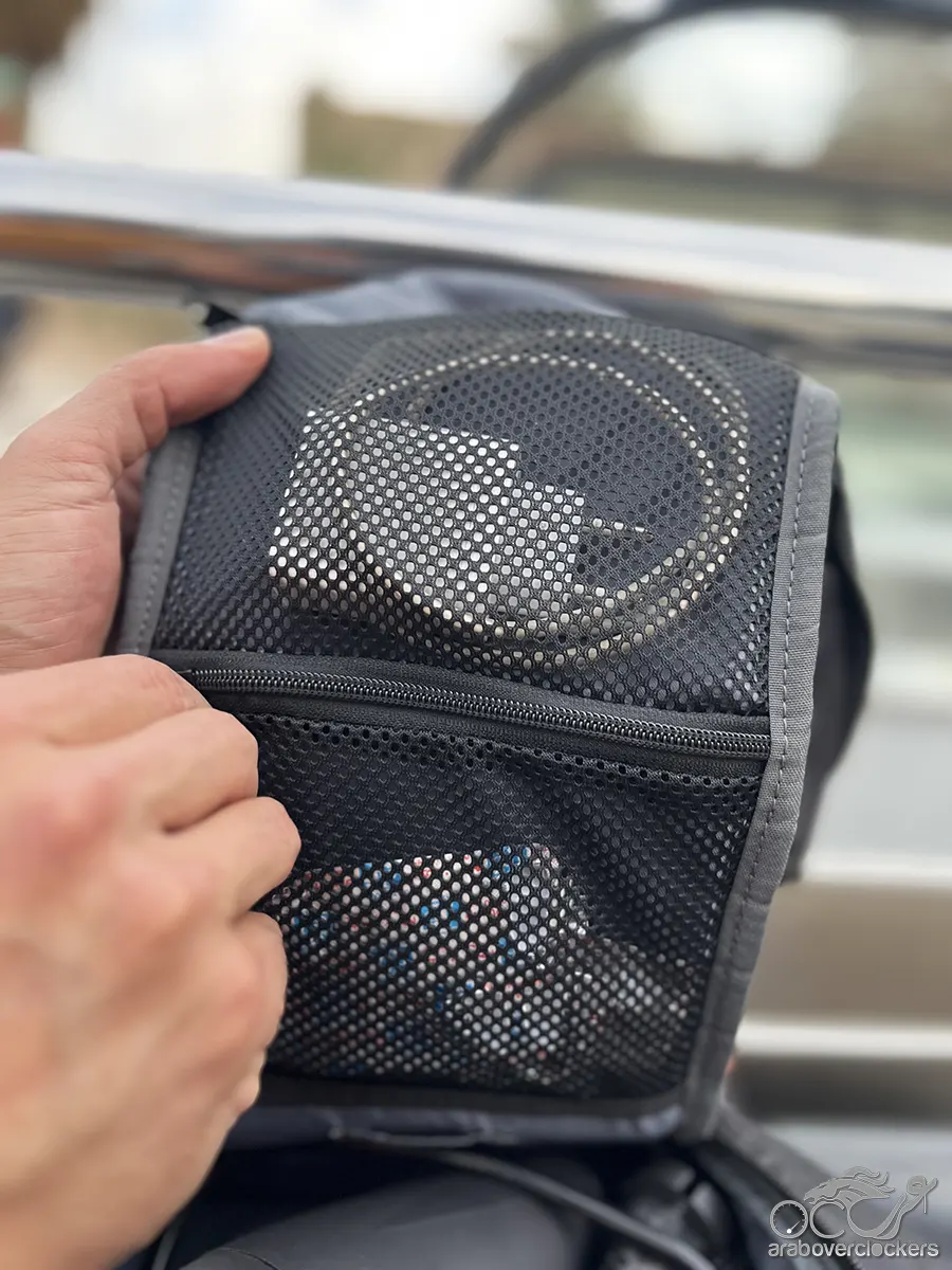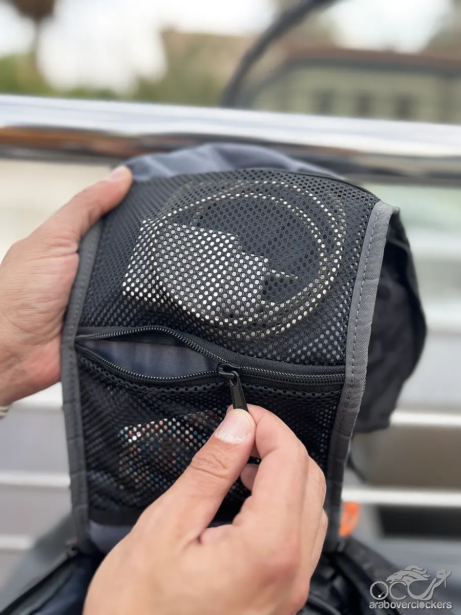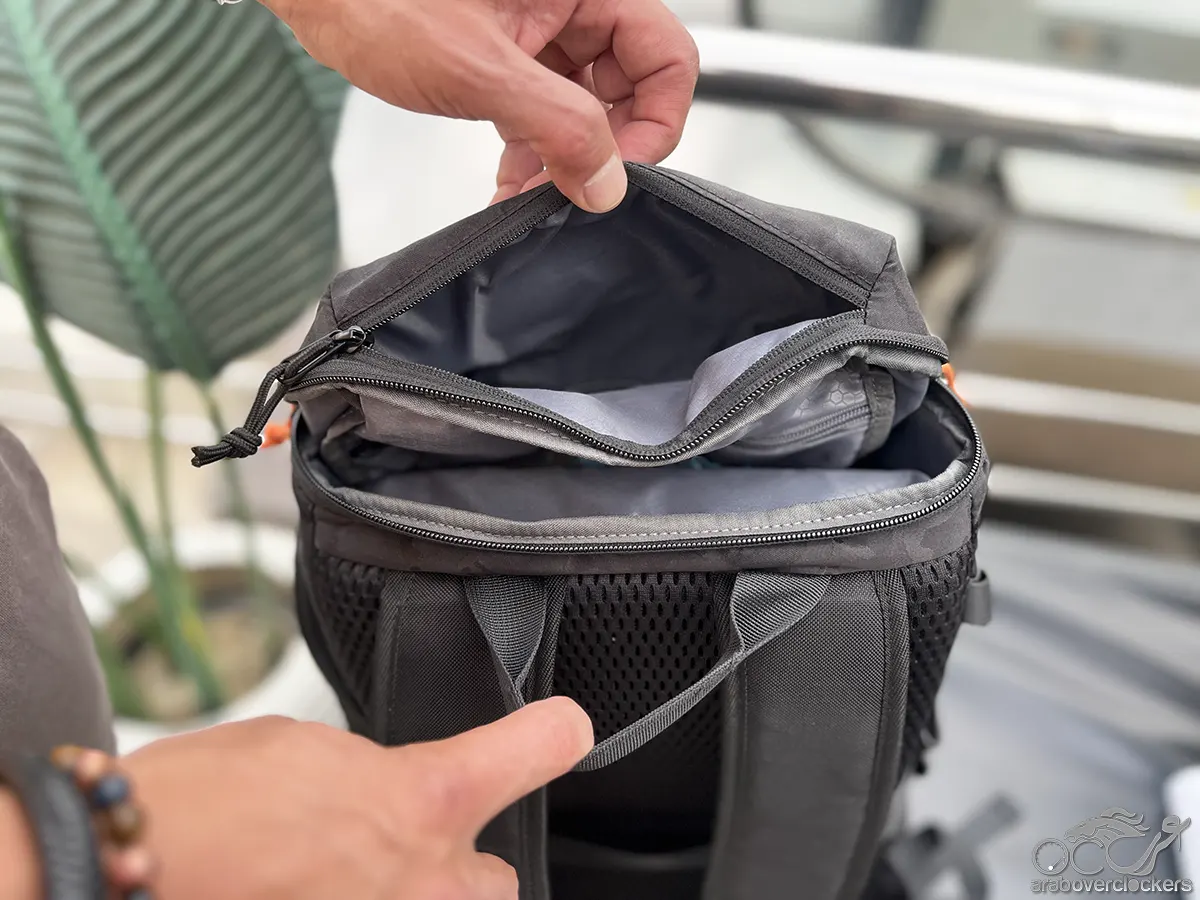 في الجزء العلوي من الحقيبة يوجد جيب وصول سريع يمكن استخدامه لتخزين الهاتف أو جواز السفر أو أي عنصر يحتاج المستخدم للوصول إليه بسرعة. المميز في هذا الجيب أنه يمكن الوصول إليه من الخلف أو من داخل الحقيبة، ما يوفر مستوى إضافيًا من الأمان أثناء التنقل.
