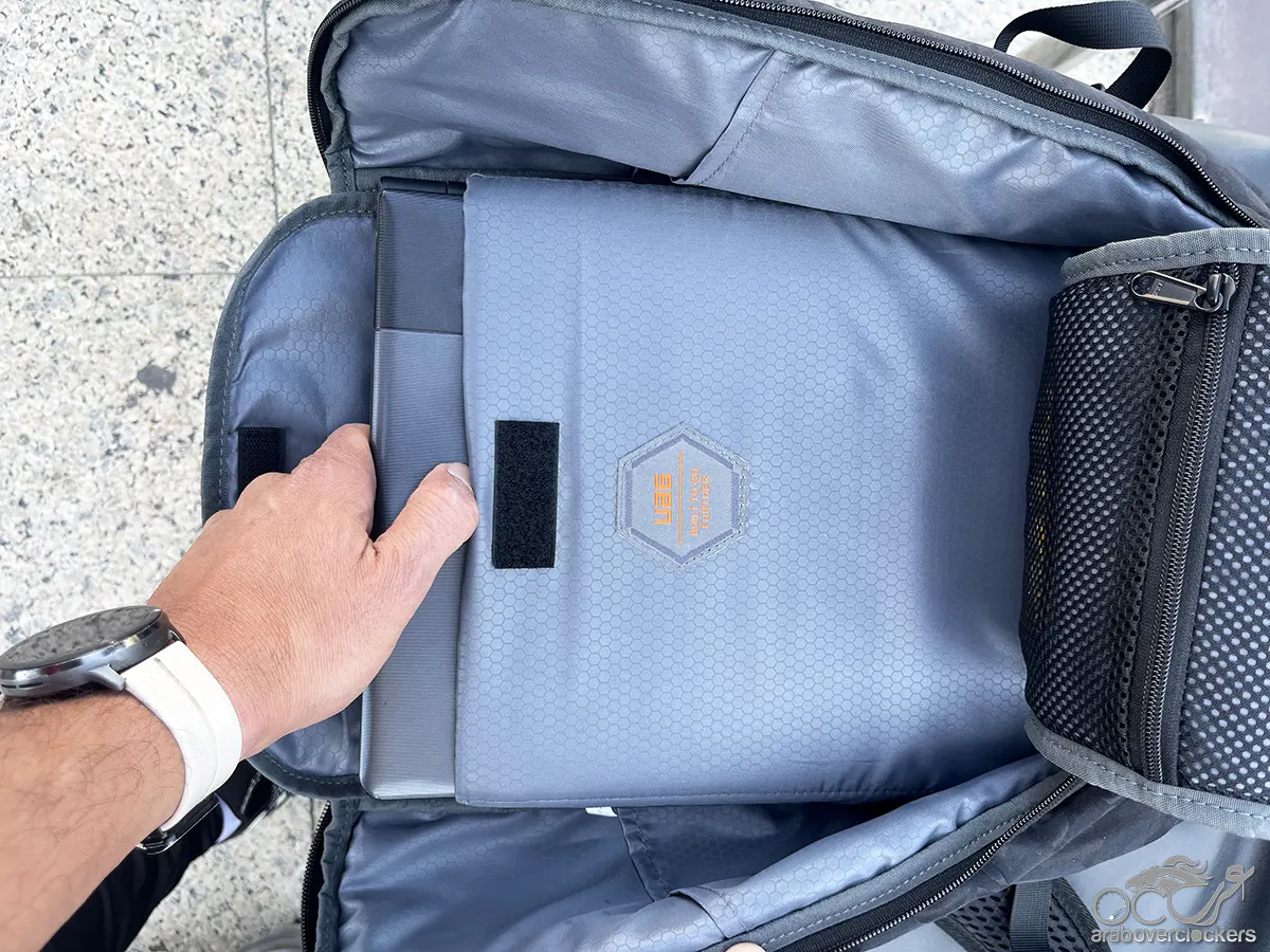 كما تم تصميم الحقيبة لتستوعب أجهزة اللابتوب حتى قياس 16 بوصة، مع مجموعة متنوعة من الجيوب التنظيمية التي تساعد على ترتيب الأغراض المختلفة بشكل عملي. وتشمل هذه الجيوب مساحات مخصصة للأغراض الصغيرة مثل الشواحن والكابلات وسماعات الأذن، إضافة إلى جيوب وصول سريع يمكن استخدامها لحفظ الهاتف أو جواز السفر أو العناصر التي يحتاج المستخدم للوصول إليها بسرعة.