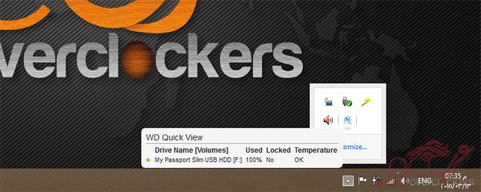 هنا بعد تنصيب البرنامج تظهر بجانب الساعه كإشعار يظهر بيانات القرص وحالته سواء الاستخدام او الحراره او كونه محمي ومغلق أو لا.