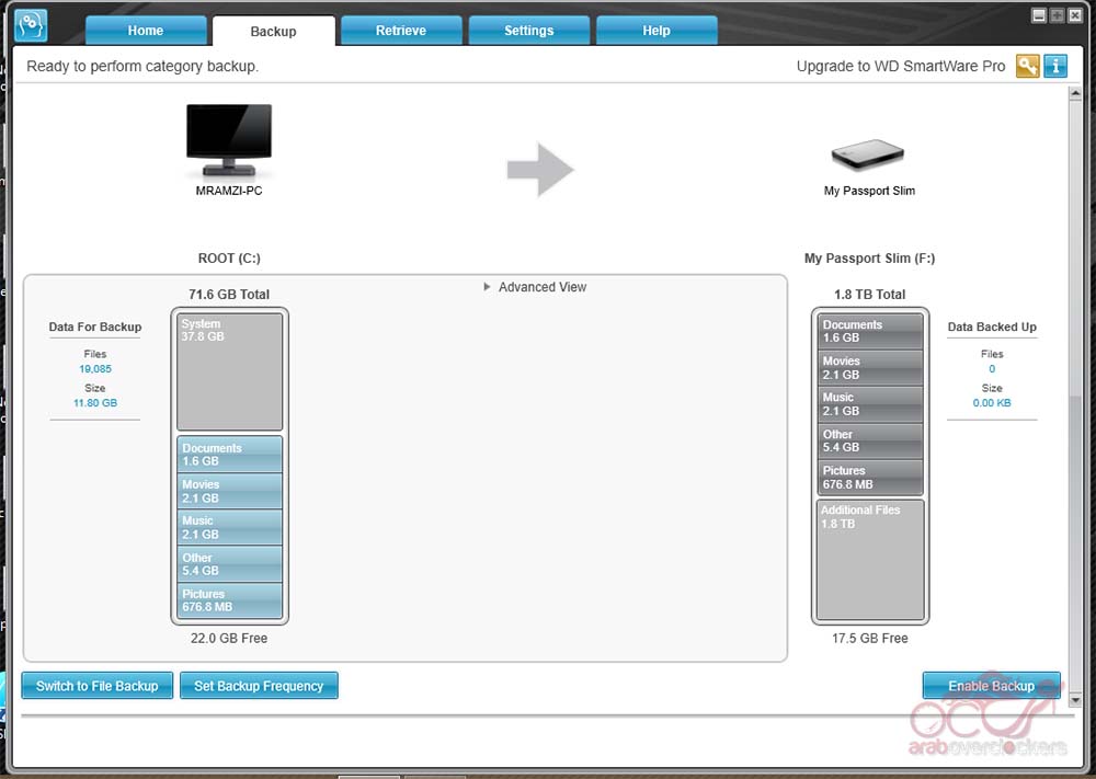 بإختيار قرص WD للنسخ الأحتياطي يظهر في النافذة التاليه Backup كمنصة النسخ الاحتياطي الأساسية والتي منها يتم التحكم في خيارات النسخ الأحتياطي سواء بتفعيله اصلاً ام لا وبتحديد مواعيد معينه.