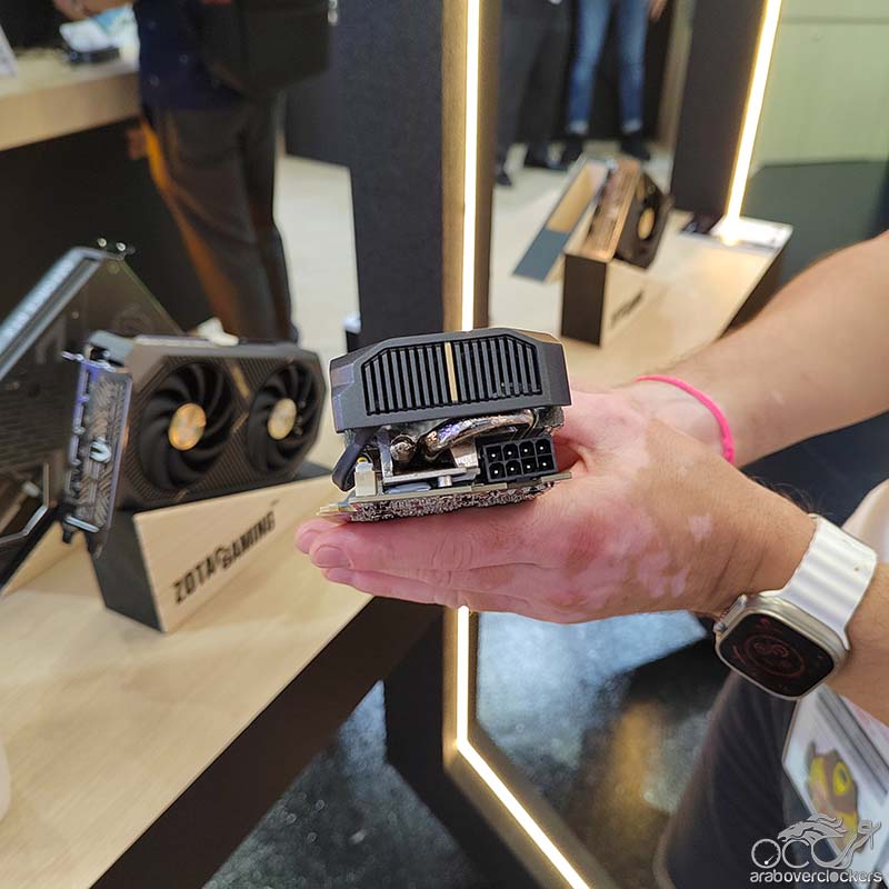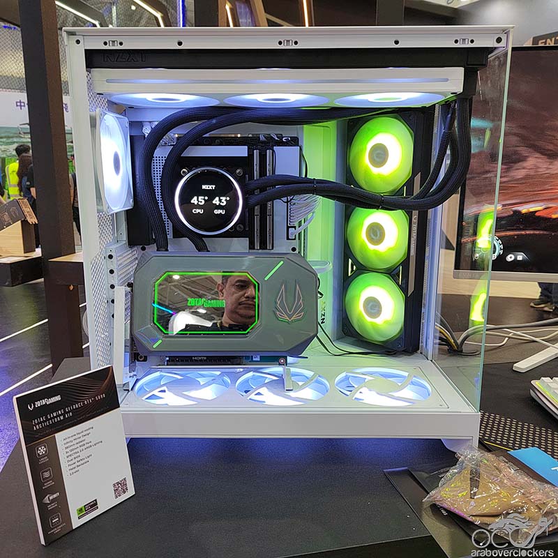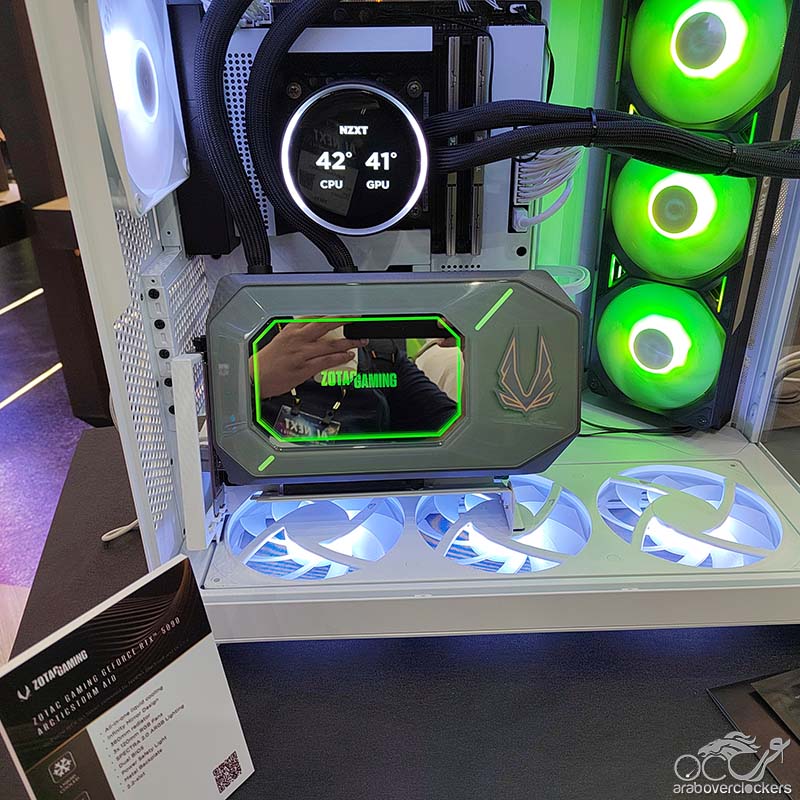 من المفاجآت المثيرة للاهتمام أيضًا في جناح ZOTAC كانت بطاقة الرسوميات RTX 5090 ArcticStorm، والتي تأتي بتبريد مائي متكامل (AIO)، لتنافس مباشرةً بطاقة ASUS RTX 5090 Astral AIO. التصميم كان لافتًا للنظر من الناحية الجمالية، إذ تمزج ZOTAC بين الشكل العصري والتقنيات الحرارية المتقدمة، لكن عند الحديث عن الجانب العملي، فإن جمهور هذه البطاقة يظل محدودًا للغاية.